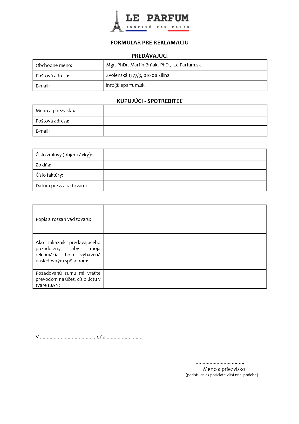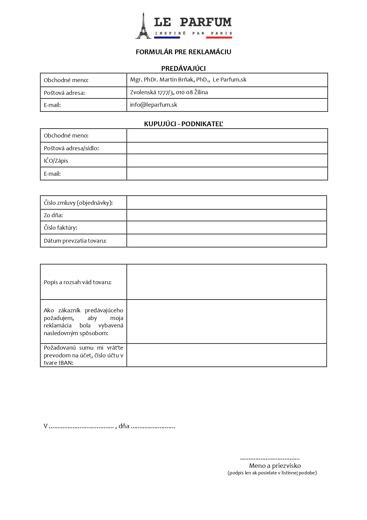 Ako určite viete, tak komunikujeme primárne na diaľku. Preto aj pre našu Zmluvu platí, že sú použité prostriedky komunikácie na diaľku, ktoré umožňujú, aby sme sa spolu dohodli bez súčasnej fyzickej prítomnosti Nás a Vás. prostredníctvom e-mailu: info@leparfum.sk. Identifikačné a fakturačné údaje: Le Parfum - inspiré par Paris, Mgr. PhDr. Martin Brňak, PhD., Zvolenská 1777/3, 010 08 Žilina, IČO: 57199051, DIČ: 1086836894, Zapísané v registri: ŽR 580-83879.